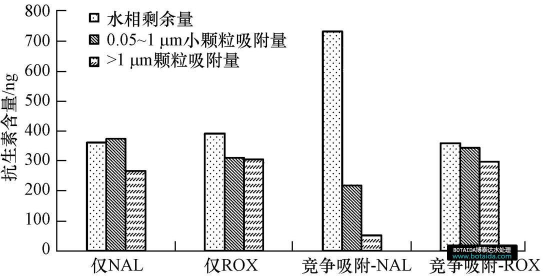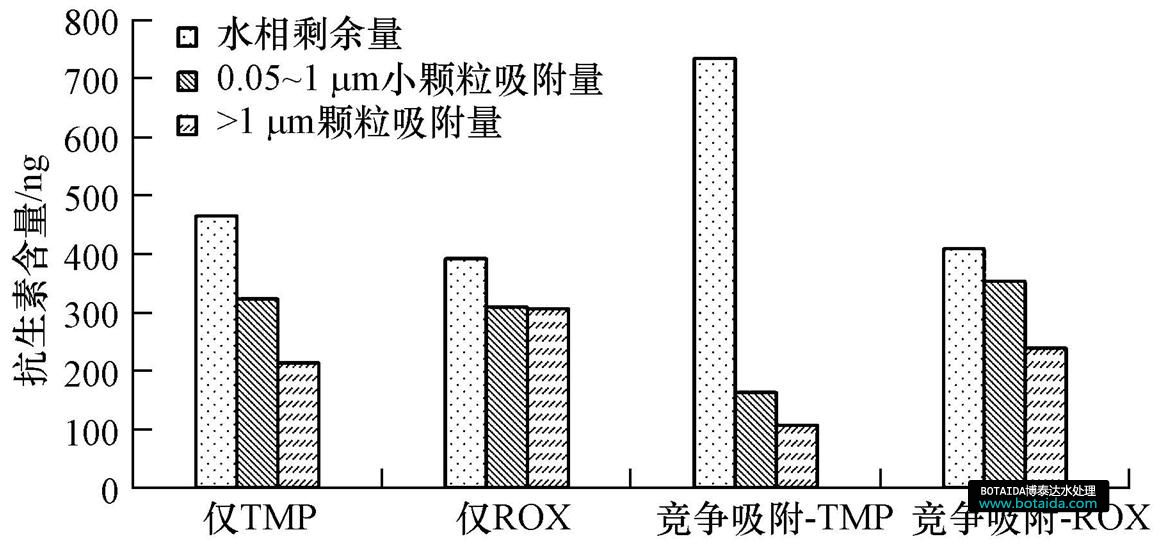 有研究發現,不同粒徑的顆粒物在天然水體中的分布不同,對抗生素的吸附能力也不同.一方面,水體中小顆粒物(粒徑<1 μm)的百分含量較高,加之其廣大的比表面積,會大量吸附水體中殘留的抗生素,然而傳統飲用水處理標準中卻沒有針對小顆粒物去除效果的相關標準;另一方面,粒徑越小,顆粒物越難以去除,其表面吸附的抗生素也會隨之殘留在水體中,對飲用水安全產生影響.基于此,本文進行了天然水體顆粒物對4種典型抗生素(羅紅霉素(ROX)、青霉素G(PG)、甲氧芐啶(TMP)、萘啶酸(NAL))的吸附平衡實驗,研究它們兩兩之間的競爭吸附特征,并分粒徑測定不同大小顆粒物上的抗生素含量,以期對飲用水水質標準和處理工藝的改善提供借鑒.