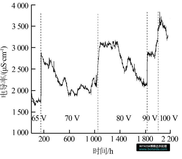 電滲析脫鹽是靠電能來遷移水中己解離的離子,因此運行電壓和水中含鹽量成正比。從圖3可以看出,進水電導率在1 800~3 800 μS/cm波動,在第182小時時進水電導率突然從1 700 μS/cm升高至 2 800 μS/cm,最高電導率出現在運行時間第2 052小時,為3 750 μS/cm,因此需要根據進水電導率的變化不斷調整運行電壓。另一方面,隨著電滲析器的運行,離子交換膜表面污染物逐漸累積,導致電阻增大,因此為保證脫鹽率以及產水水質,也需要逐步提升運行電壓。因此,在整個試驗期間,運行電壓逐步從65 V調整至100 V,以保證產水水質滿足循環水補水要求。