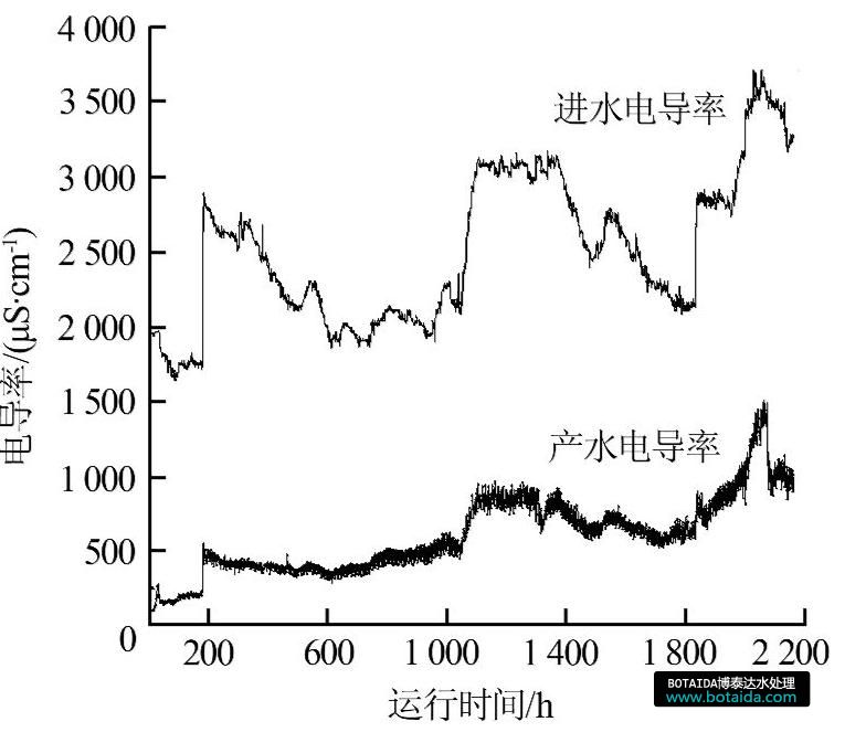 從圖4可以看出,在試驗前1 000 h內,產水電導率在500 μS/cm左右,到試驗后期產水電導率基本維持在1 000 μS/cm上下。
