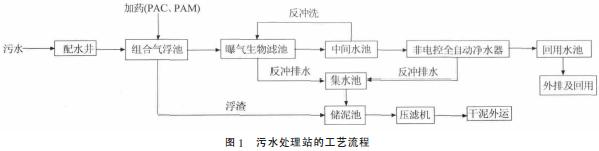 處理過程中產生的污泥主要包括斜管沉淀池污泥和淺層氣浮剩余污泥。污泥泵入污泥濃縮池進行濃縮,濃縮污泥脫水后外運處理。脫水機房產生的污泥過濾液和反沖洗水收集于脫水機底部集水槽中,可以通過管路連接自流入集水池,重新處理。