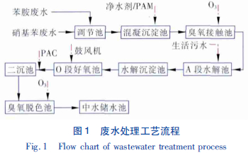 A/O 工藝是一種有回流的前置反硝化生物脫氮工藝,由前段缺氧池、后段好氧池串聯組成。采用A/O 系統先在兼氧條件下還原硝基苯為苯胺,同時由于兼性脫氮菌的作用,將NO2--N 和NO3--N 還原成N2,排入空氣中完成脫硝過程,然后在好氧條件下,利用生物的變異性,可篩選出一些特異性好氧菌種用于處理硝基苯廢水,使廢水中的硝基苯得到有效降解并減少部分色度,同時達到脫氮效果,降低后續生物處理的負荷,提高后續處理的穩定性和效果。