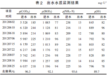 系統經過2個月調試后,各項測試指標均達到污水處理廠的接管標準。運行結果表明,該系統運行穩定,抗沖擊負荷能力強。環保部門抽檢及企業自檢結果顯示,廢水各項指標均穩定達標。近期運行數據見表2。由表2 可見,廢水經過“預處理-UASB-二級接觸氧化”工藝處理后,平均去除效率分別為CODCr96.3%,BOD5 92.1%,NH3-N 93.6%,SS 89.7%,出水監測指標均優于接管標準。