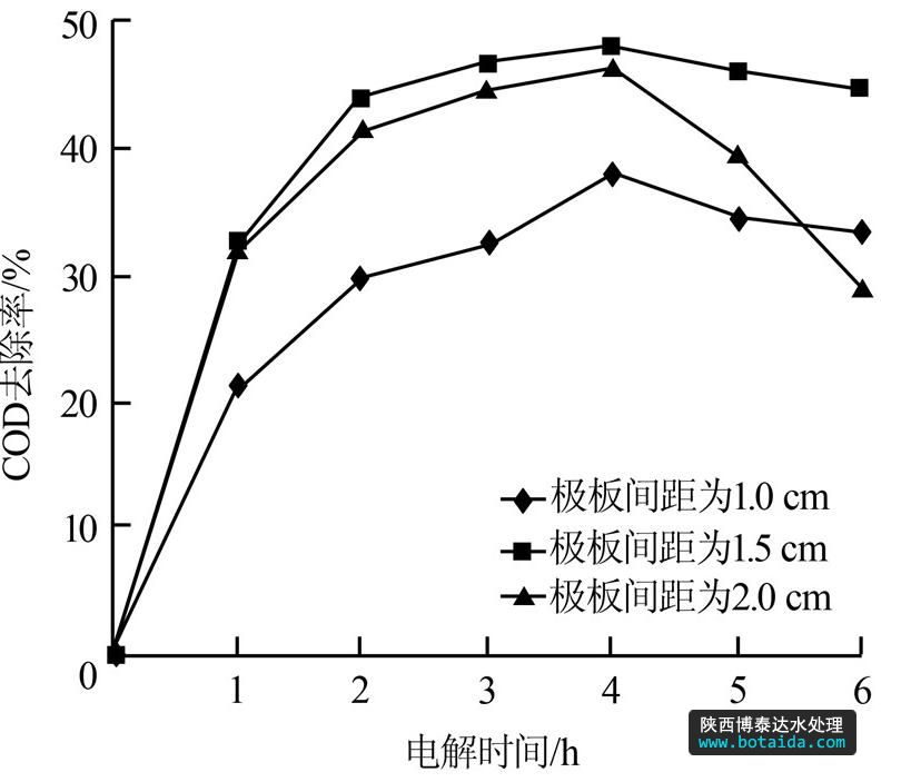 (3)調節極板間距至1.5~2.0 cm對提高垃圾滲濾液的COD去除率有利。過小的極板間距會產生短路現象,過大則會降低去除效果。