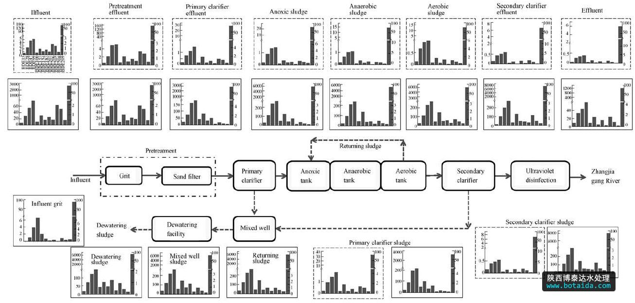 2012年4月份則采集了該廠各個構筑物的出水和污泥樣品,采樣點和類型見圖 1.我們在14: 00—17: 00之間,每個小時分別采集該構筑物的污水和污泥樣品,然后分別將污水和污泥樣品混合在一起作為一個混合樣.污水和污泥樣品是分別用干凈的棕色玻璃瓶和廣口瓶采集的,每個采集瓶上方不留空間,采集完之后立馬放入冰袋中,并運到實驗室保存.