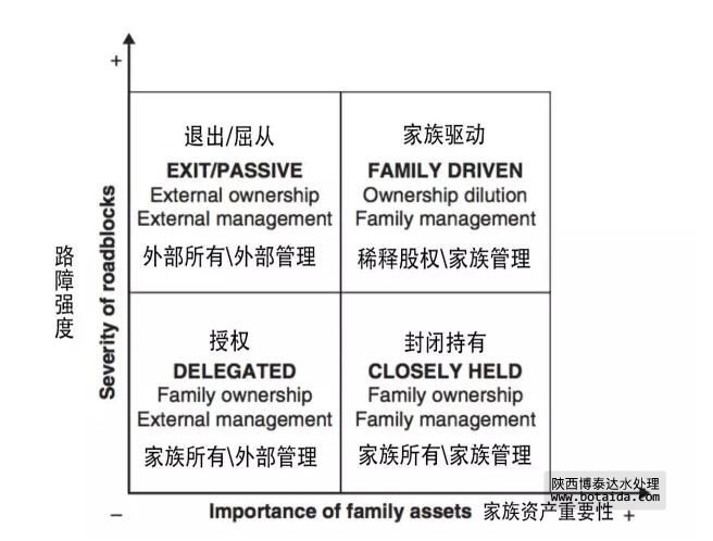 家族企業路線圖為家族可以選擇的路線提供了一個非常簡明的圖解。通常,它能做出如下預測:家族資產漸趨減少的企業應該更多地尋求外部管理的介入,而目前以及未來面臨重大障礙的企業,則應該積極尋求所有權結構的改革,以便將障礙可能造成的損失減小到最低。