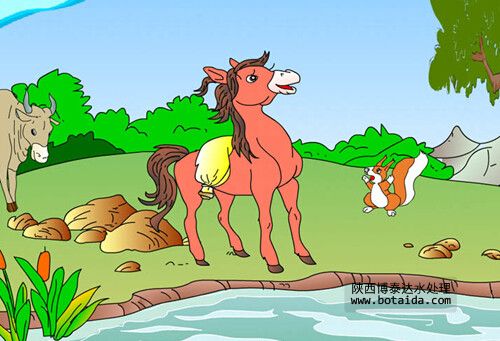 他剛一邁腿,忽然聽見一個聲音說:“小馬,小馬別下去,這河可深 啦。”小馬低頭一看,原來是小松鼠。小松鼠翹著她的漂亮的尾巴,睜者圓圓的眼睛,很認真地說:“前兩天我的一個伙伴不小心掉進了河里,河水就把他卷走了。”小馬一聽沒主意了。