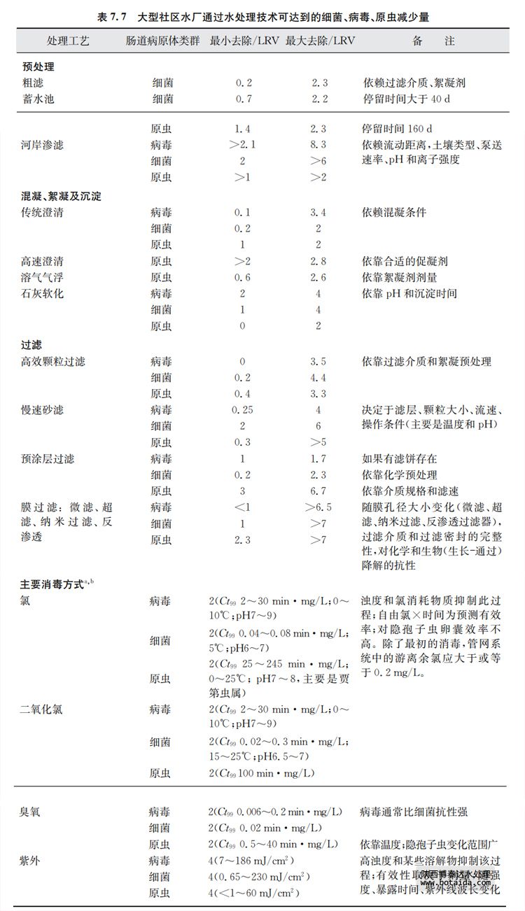 表7.7中列出的微生物降低水平是指微生物的大類群或類別:細菌、病毒和原蟲。由 于各種微生物本身所固有的特性(如大小、外保護層特性和表面理化性質等)不同,因而不同 種類的微生物的處理效果往往存在差異。在這些微生物類群中,處理效果在特定的種、型、 株間差別較小。但這種差別確實存在,表中針對各類群微生物中抵抗力強、存活時間久的病 原體列出了去除的保守估計。若某一微生物類群中不同的病原體在處理后下降值差別較大 時,則在表中單獨列出針對相應病原體的處理結果。