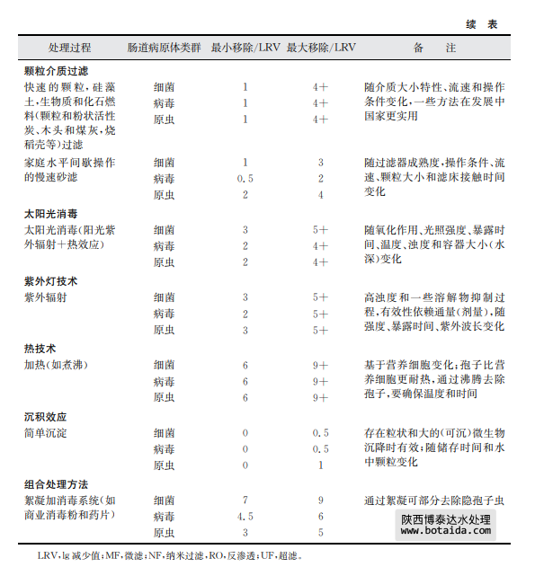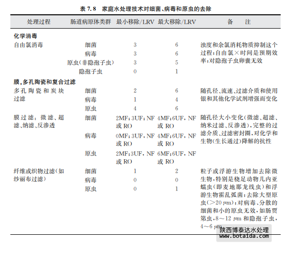 表7.8總結了采用上述幾種家庭水處理技術對水傳播細菌、病毒和寄生性原生蟲的 去除情況。這些去除信息是基于科學文獻報告的研究結果。有兩個有效性內容:基本去 除和最大去除。基本去除是指由相對不熟練人員實際操作時的一般運行效果,且操作人 員將以上方法用于處理平均水質或可變水質原水及現場只有很少應用工具以優化處理條 件和操作時。最大去除是指在熟練操作和優化運行條件下,并且在可預見和不變水質條 件下,有相關儀器工具支持并保持最高水平運行時達到的效果(如測試一個已知濃度和種 屬的微生物時)。應當該注意的是某些水處理工藝的lg減少值存在差異,如表7.8中的 家庭水處理和表7.7中的集中處理。這種相同處理技術、不同的運行效果差異是可以理 解的。因為集中處理所用水通常滿足處理工藝所需要的質量,而且處理過程由訓練有素的操作人員使用,工藝經過合理的設計并有良好的運行控制系統。相反,家庭水處理通常 水質變化較大,也沒有得到最好的運行技術優化。相對于管理集中處理設施的人員,處理 過程也常常得不到專業人員的專業運行控制。這些處理過程的進一步細節,包括運行影 響因子和表7.8中提供的lg減少值水平基礎,可見附錄1支持性文件《家庭水管理和家庭 水處理選擇評估》。陜西博泰達水處理為您提供服務。