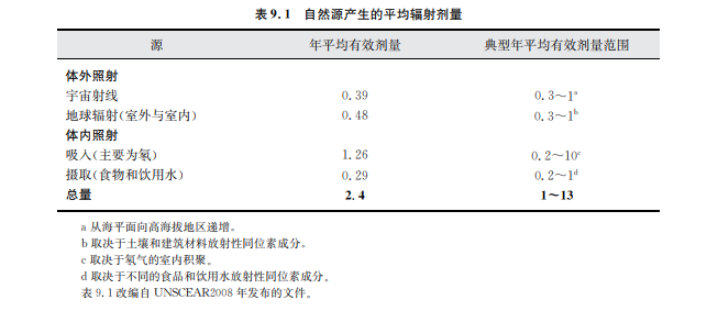 據聯合國輻射效應科學委員會估計(UNSCEAR,2008),全球每人接受來自環境中所有 放射源的年平均劑量約為3.0mSv/年(物理量解釋見專欄9.1)。其中,80%(2.4mSv)來自 自然源,19.6%(接近0.6mSv)來自醫療診斷輻射,而剩下的0.4%(約0.01mSv)來自于其 他人工源(見圖9.1)。對于整個人群,每個人所接受的輻射劑量變化很大,取決于居住地點、 飲食規律和生活方式等因素。個人輻射劑量也可能因醫療暴露和職業暴露而不同。表9.1 列出了年平均劑量和天然來源個人輻照劑量的典型范圍(UNSCEAR,2008)。