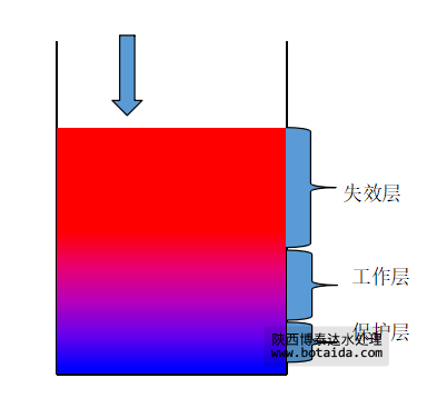 當水流首先接觸的上層交換劑失效后,繼續進入的原水就與下一層交換劑進行離子交換,從而使工作層不斷下移。整個交換劑層便分為三個區域。隨著交換劑的運行,失效層的區域不斷增大,工作層不斷下移,未交換區域隨之減少。