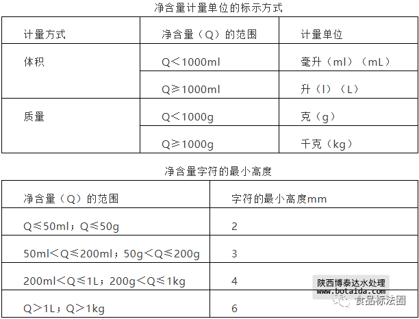 凈含量的標示應由凈含量、數字和法定計量單位組成。應與食品名稱雜包裝物或容器的同一展示版面標示。