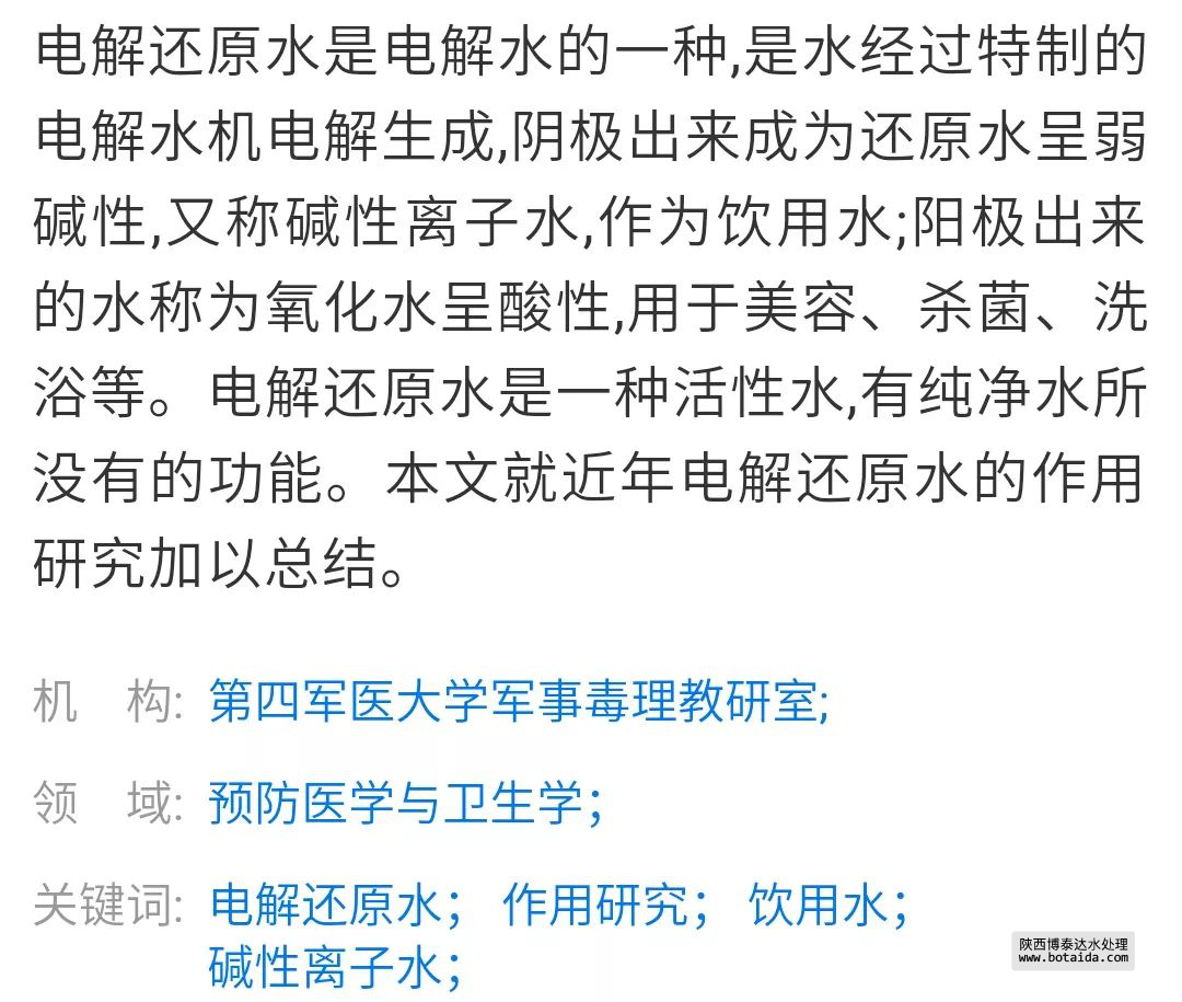 通常情況下,電解還原水是由普通的自來凈化水,然后通過陰陽電極,在電場的作用下將水分子團打散、變小、重新排列,使水分子的結構發生改變,使其中一部分水的氧化還原電位呈正值,另一部分水的氧化還原電位呈負值,最后通過膜分離技術得到電解還原水,使之具有醫療保健作用.