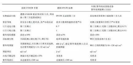 對比國內外驗證標準,美國UVDGM手冊適用范圍相對較小。UVDGM手冊主要針對公共供水系統消毒,手冊中涵蓋了實施紫外線消毒系統的許多方面,但并沒有全面介紹所有類型的紫外線消毒系統、設計替代方案以及驗證協議。德國DVGW標準適用于所有紫外線殺菌設備,目標病原體涵蓋范圍廣。中國《紫外線水消毒設備紫外線劑量測試方法》(GB/T 32092—2015)分別對飲用水、再生水和污水規范了不同的目標微生物,涉及范圍廣。表1為國內外驗證標準的對比,這些規范指導原則不同,但都推動了紫外線技術在全球范圍內的推廣和運用,為公共飲用水安全保障做出了貢獻。