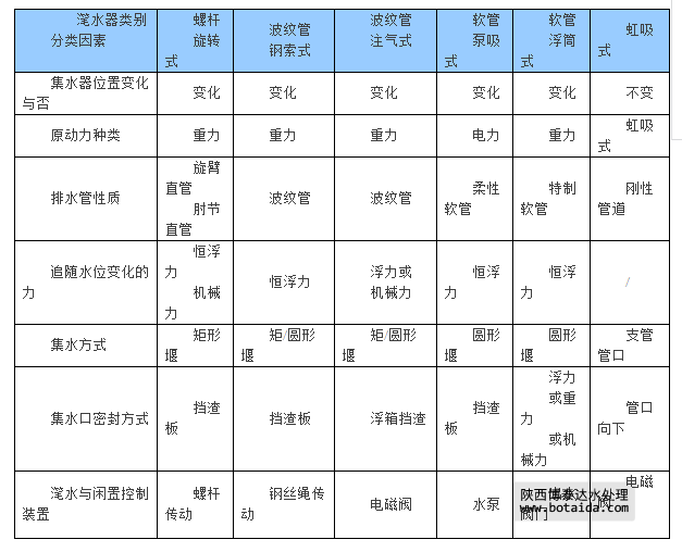 軟管泵吸式潷水器主要浮筒、潛水泵、柔性排水管和導軌組成,其追隨水位變化是靠浮力,也依靠排水管的柔變或伸縮,泵的吸入口用檔板式浮筒圍住,阻止浮渣的流入。曝氣時吸入口會進入污水,故潷水前必須先排污水。