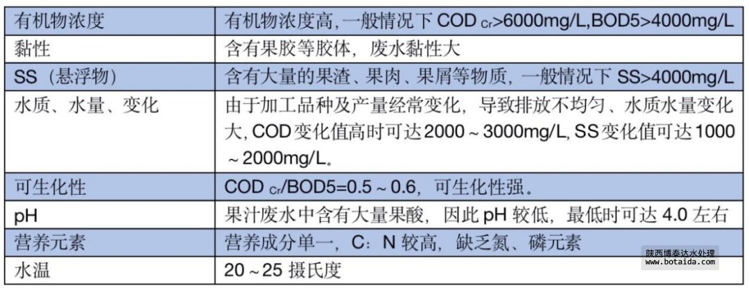 果汁廢水主要來自沖洗水果、粉碎、榨汁等工序,罐裝工段的洗瓶、滅菌、破瓶損耗和地、面沖洗等環節。廢水中含有較高濃度的糖類、果膠、果渣及水溶物和纖維素、果酸、單寧、 礦物鹽等。