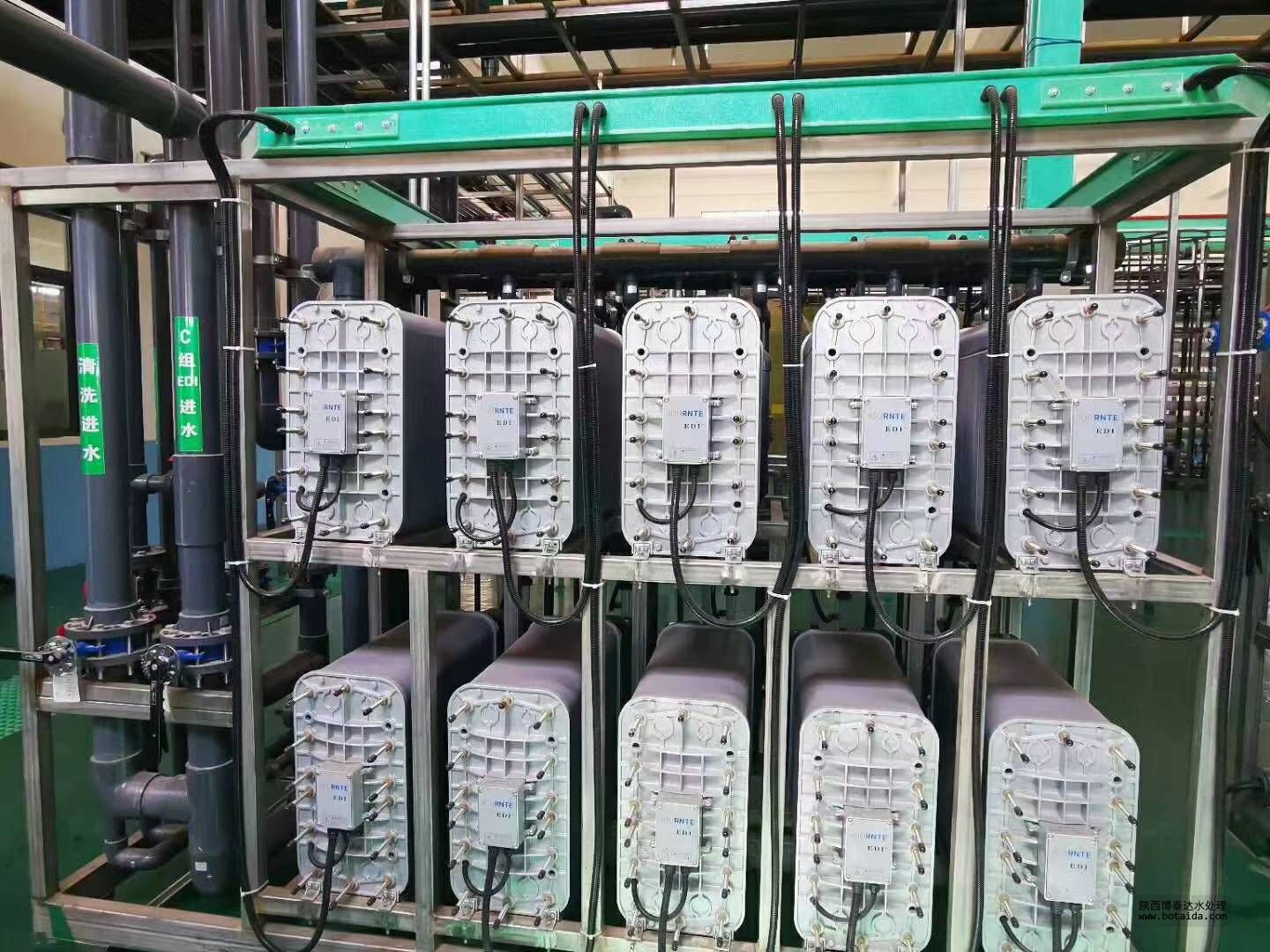 4、原水箱→原水增壓泵→石英砂過濾器→活性碳過濾器→軟水器→保安過濾器→反滲透系統→中間水箱→水泵→EDI裝置→純水箱→純水泵→紫外線殺菌器→0.2或0.5μm精密過濾器→用水對象(≥15MΩ.CM)(最新工藝)